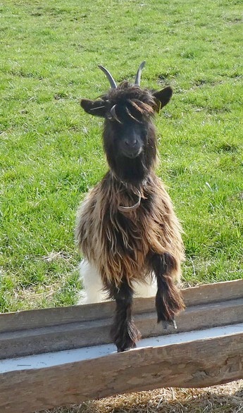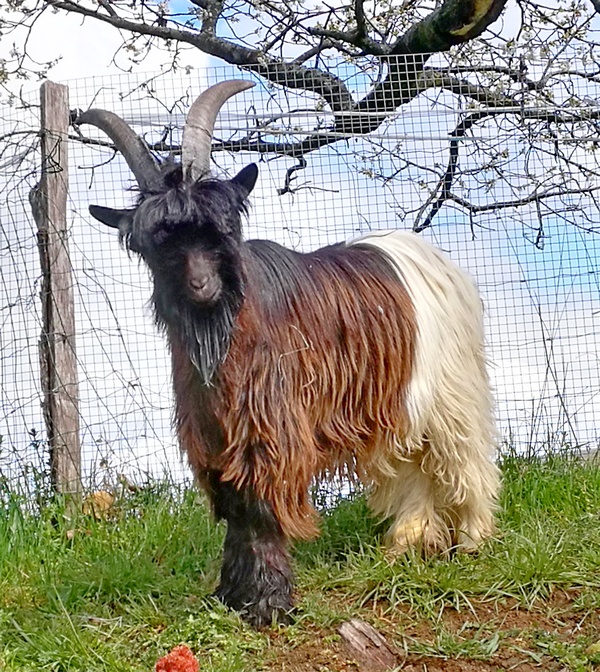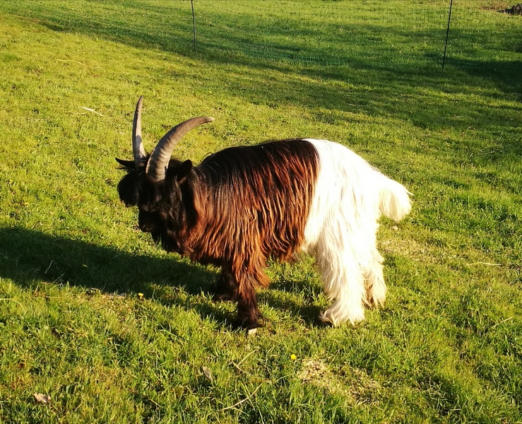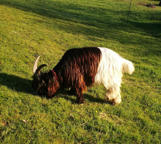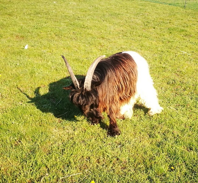 Nous avons aussi la joie d’accueillir de nouveaux compagnons comme Buzz et Oup’s 1 bouc et une chèvre Col noir du Valais ,une race de chèvre assez rare originaire (comme nos mouton nez noirs) du canton du Valais en Suisse et qui a la particularité d’avoir une toison aux poils trés longs et coupée en 2 couleurs noir et blanche (elle peut être également fauve et blanche ou grise et blanche mais dans tous les cas avec l’arrière blanc et l’avant de couleur)